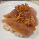 Introducing the Santal Roll: a tantalizing fusion of flavors and textures that will take your taste buds on an unforgettable journey. Inside, you'll find a delectable combination of spicy crab, scallops, and crispy shrimp tempura, creating the perfect balance of savory and crunch. Topped with fresh salmon, creamy avocado, and a slice of zesty lemon, this roll is drizzled with ponzu and sriracha sauce for a burst of flavor. Finished with green onions and sesame seeds, the Santal Roll is an irresistible masterpiece. Experience it today!