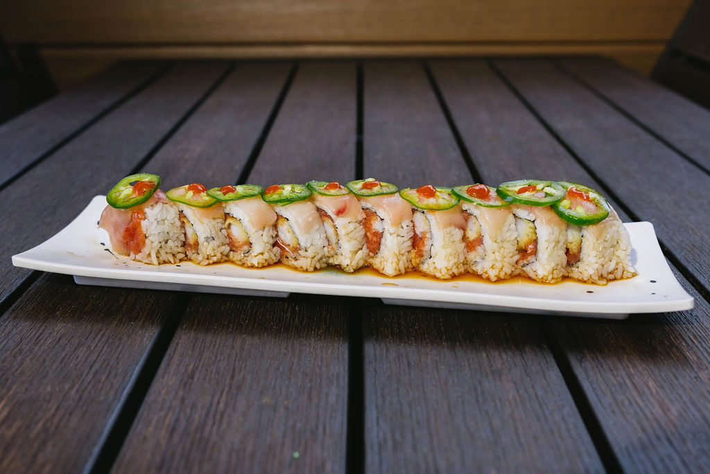 Outside: fresh yellow tail, ponzu, jalapeno slices with a dab of sriracha