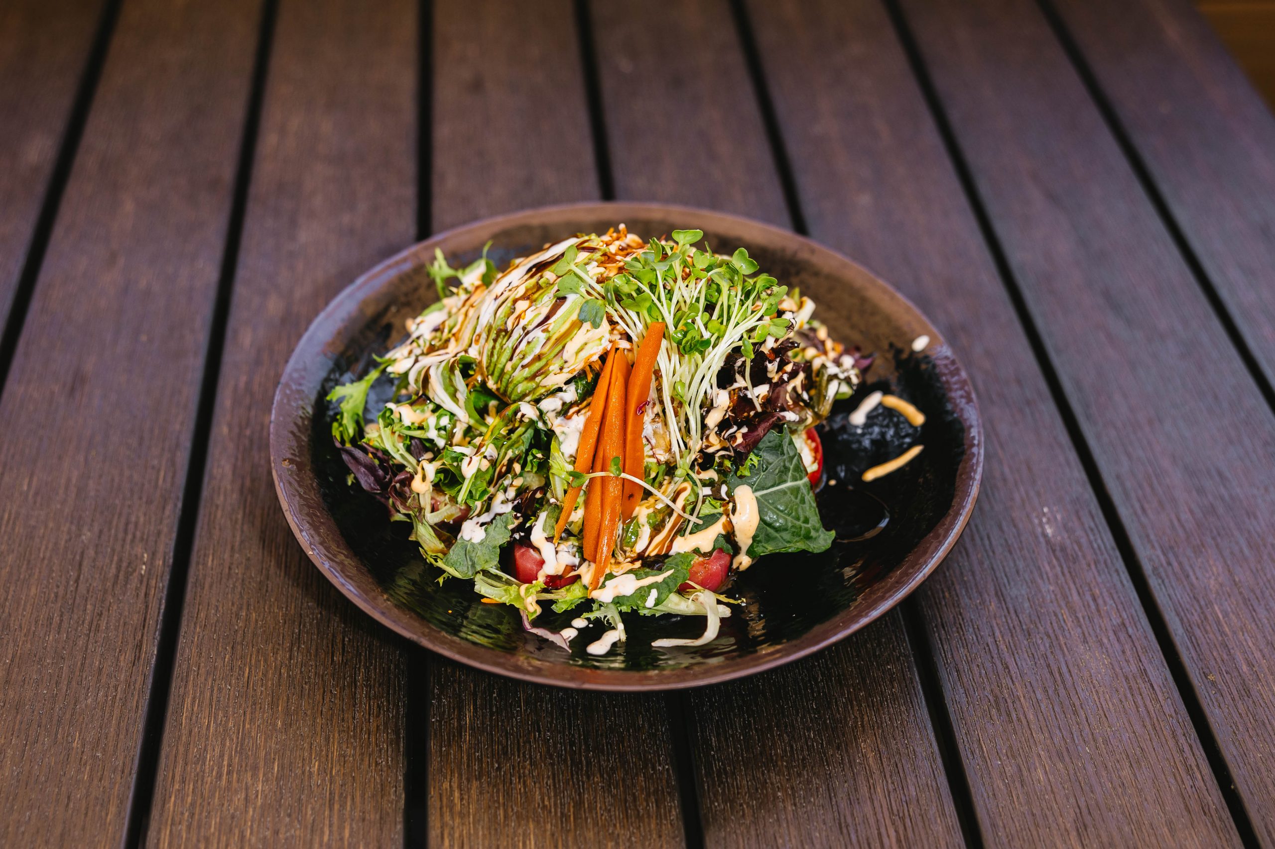 Mixed greens, gobo root and avocado on top of a tuna and crab roll, drenched in our secret sweet and sour dressing – delicious!
